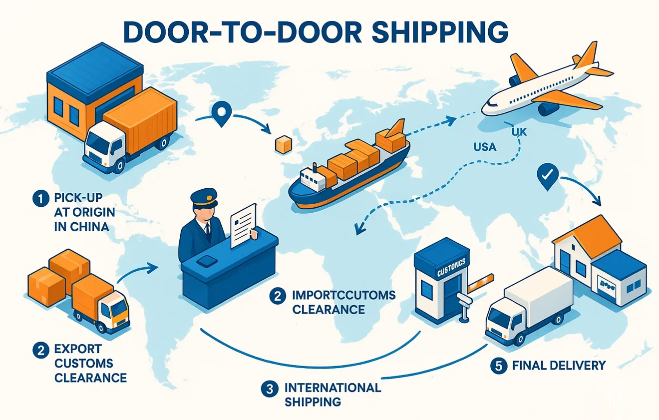 Door-to-door service means we handle everything — pickup, export customs, international transportation, import clearance, and final delivery — so you don’t have to.